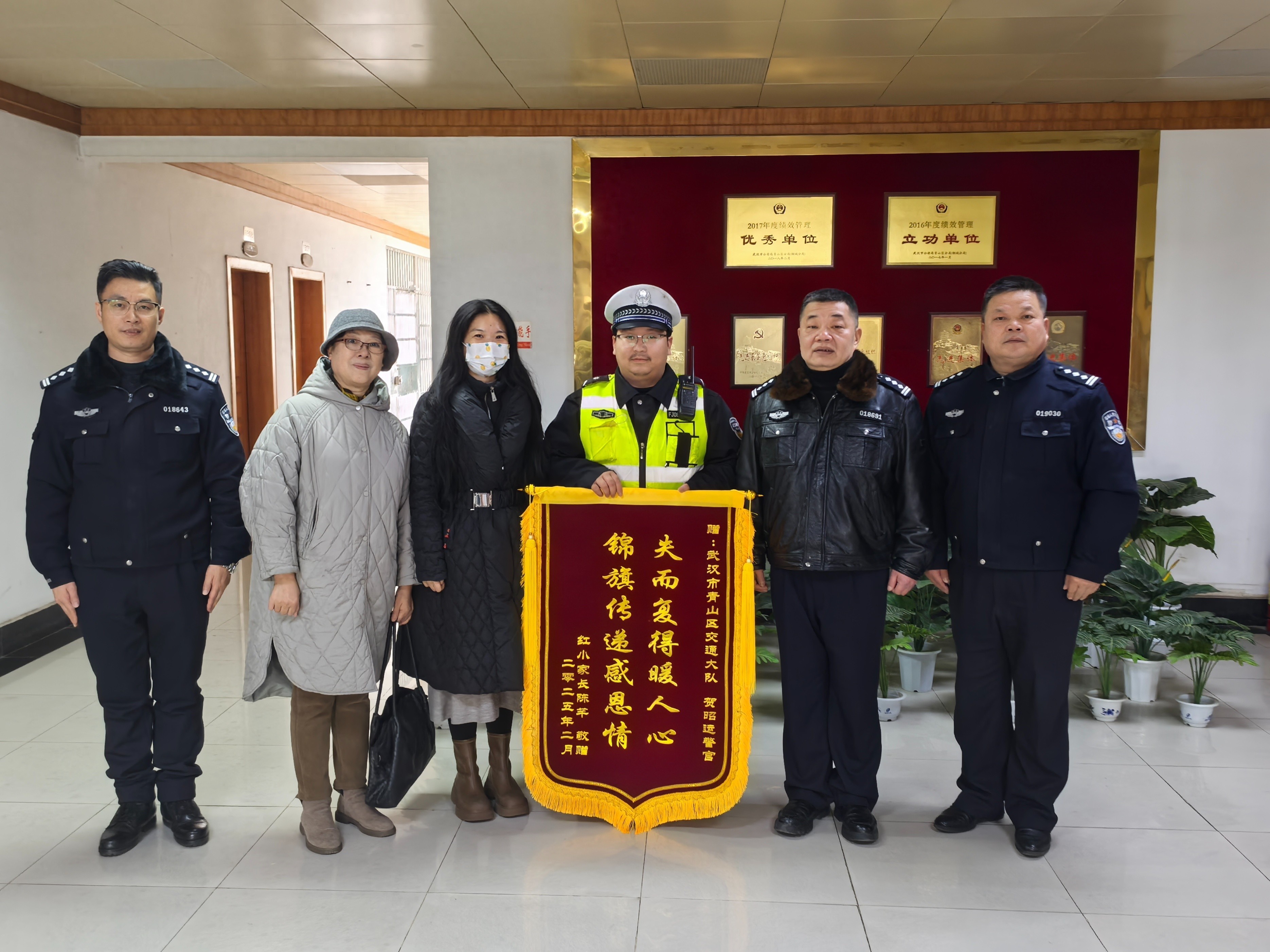 2025年2月25日,武汉市青山区交通大队一中队收到群众送来的印有“失而复得暖人心,锦旗传递感恩情”的锦旗,对交通警察为群众办实事的工作态度和无私行为表示深深谢意。